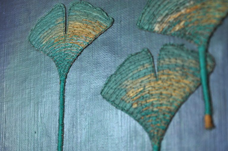 Ginkgobladeren, bewerkt met zijdegaren en metallic verf, natuur op een paneel, uniek aan je muur.