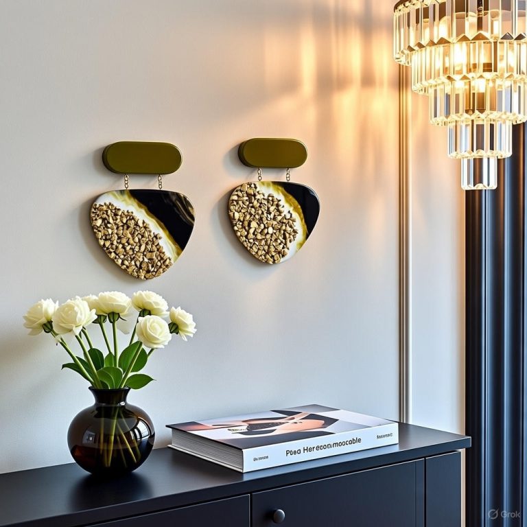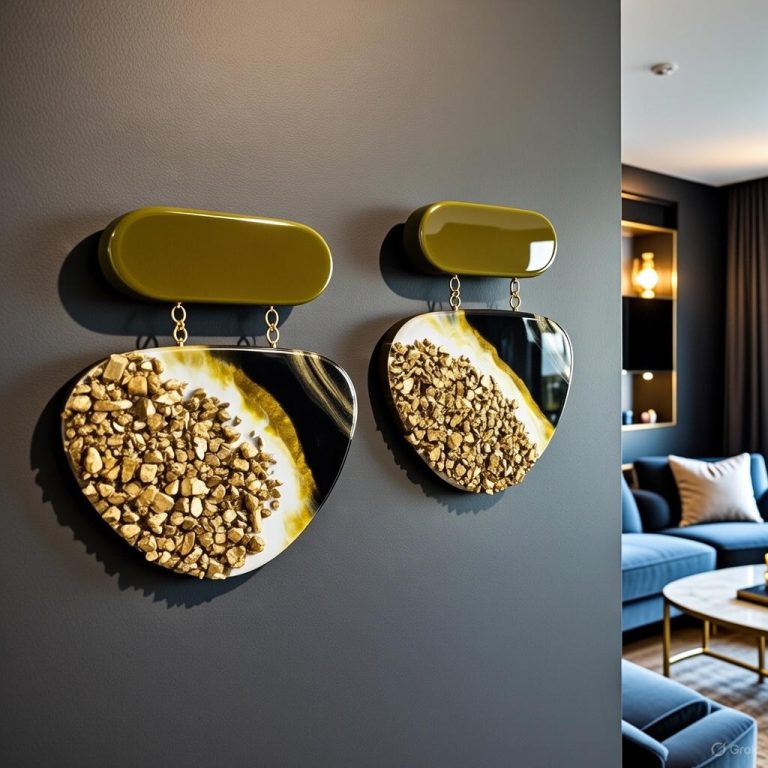 Dit wand juweel bestaat uit een glanzend olijfgroen bovenstuk met een hanger in een geode achtige voorstelling. Voorzien van gouden stenen en kunsthars in verschillende kleuren zoals goud en groen. Afgewerkt met stoere gouden kettingen en een moderne gouden rand.