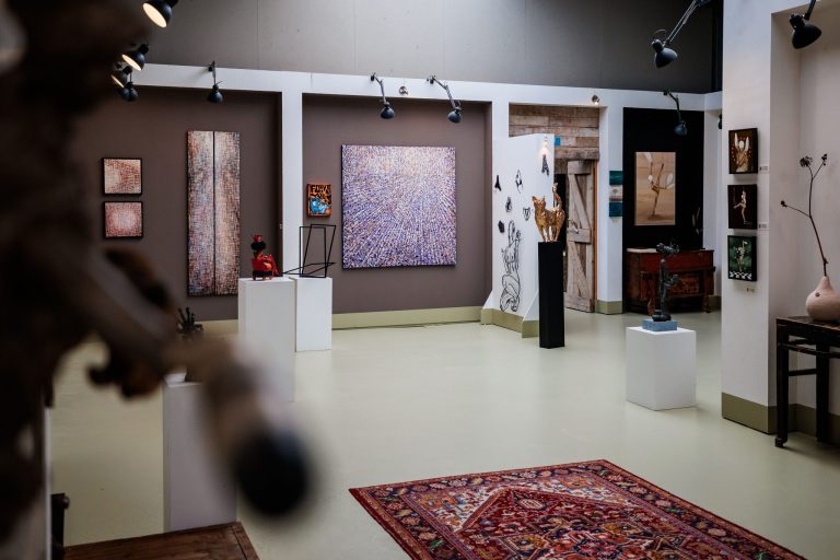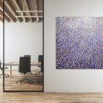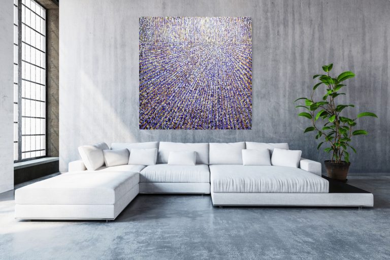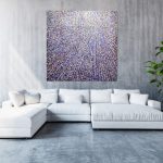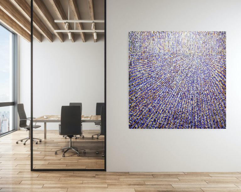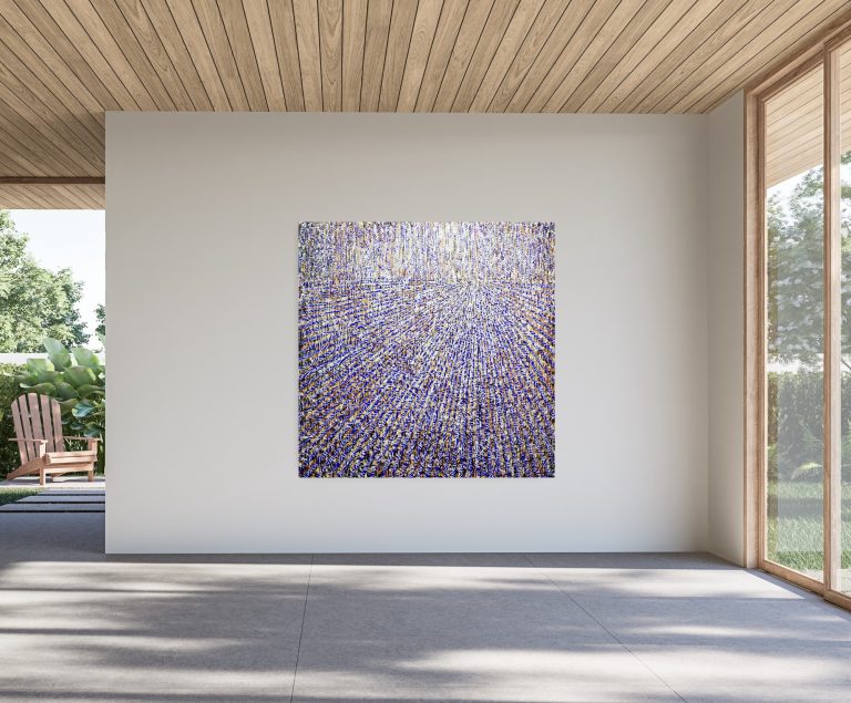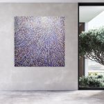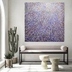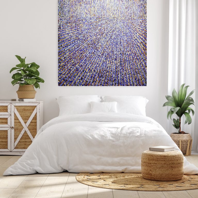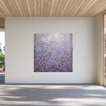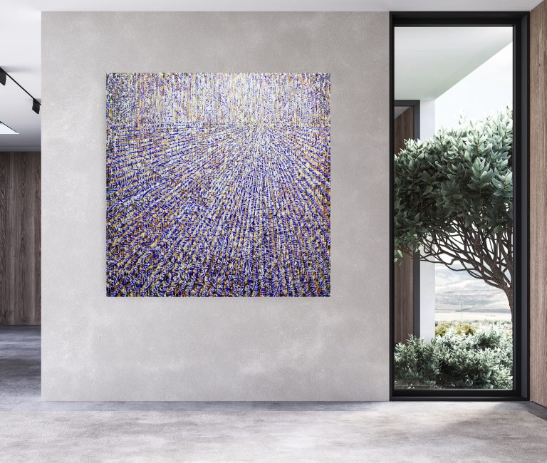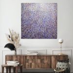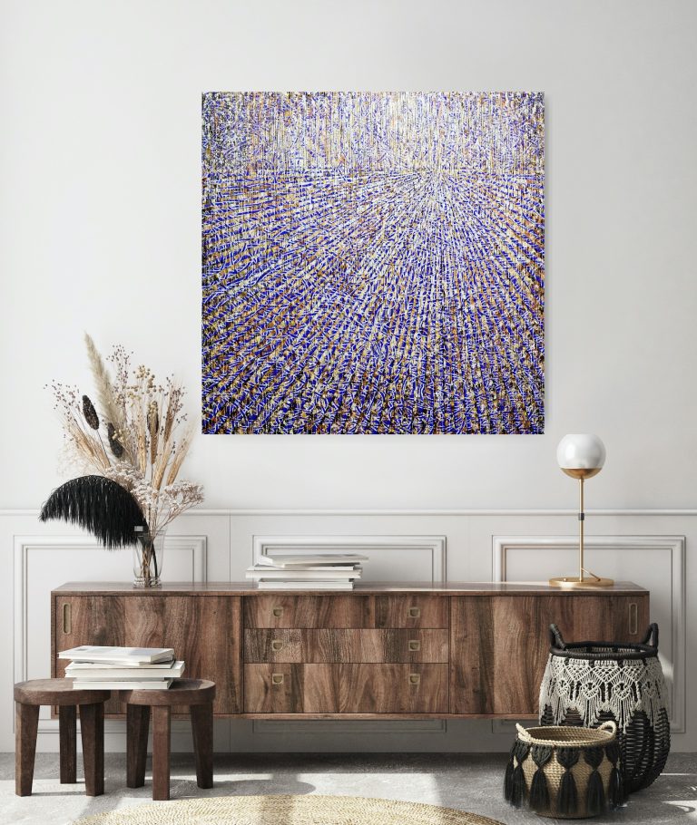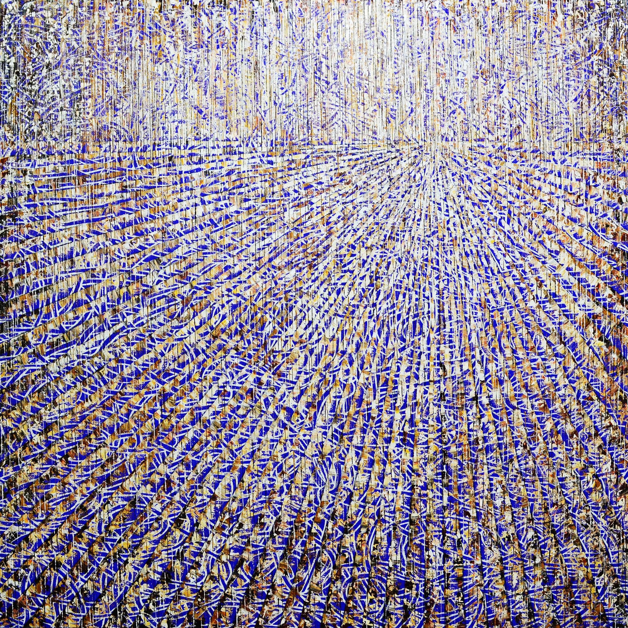 In dit werk heeft Martin gebruik gemaakt van een houtsnede druk in de onderlaag om beweging in het werk te laten ontstaan en daar op zijn herkenbare manier met olieverf overheen gewerkt.