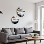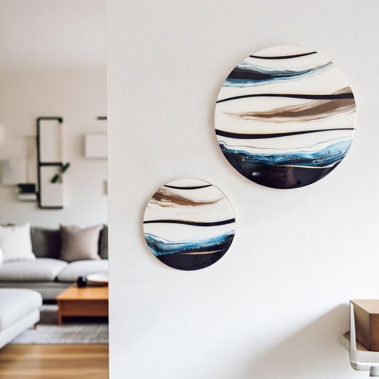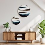 Mooie set van 2 ronde panelen in de tinten van de zee. Ingelegd met bladgoud, wat vooral in de avond het licht prachtig weerkaatst, als de zon op de golven. Afgewerkt met hoogglans kunsthars en een moderne gouden rand.