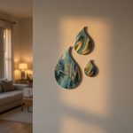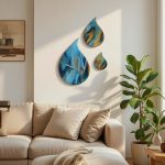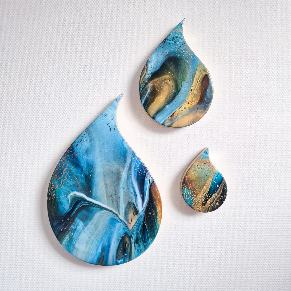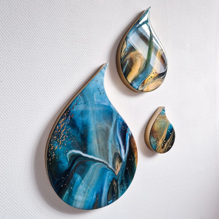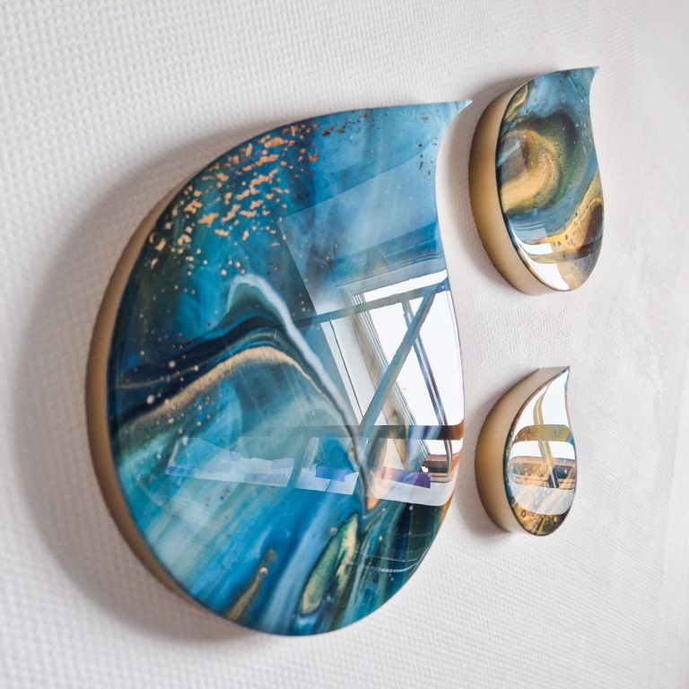 Deze mooie set van 3 hoogglans druppels zal je muur een unieke twist geven met hun speelse vorm, intense kleuren en glinstertje in de verf. Afgewerkt met hoogglans kunsthars en een moderne gouden rand.