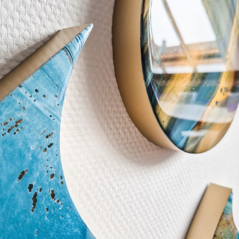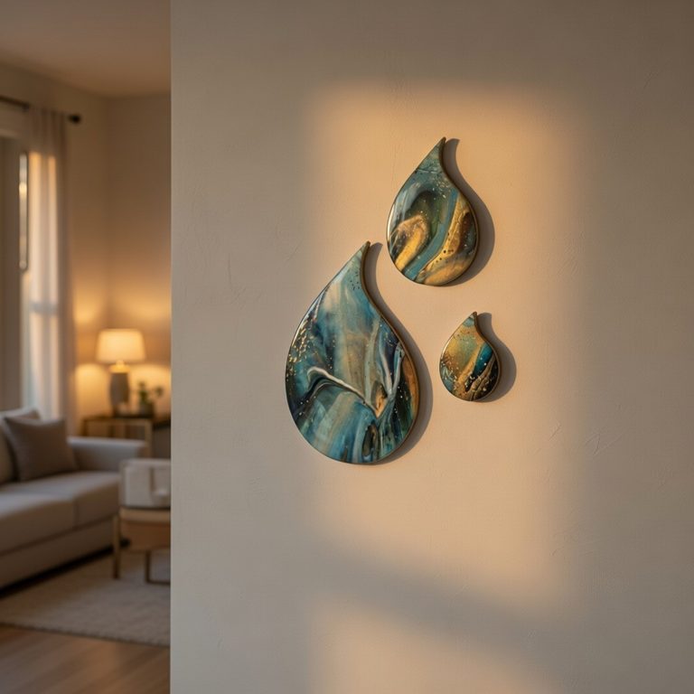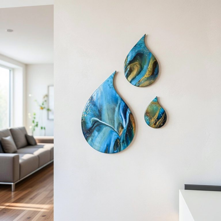 Deze mooie set van 3 hoogglans druppels zal je muur een unieke twist geven met hun speelse vorm, intense kleuren en glinstertje in de verf. Afgewerkt met kunsthars en een moderne gouden rand.