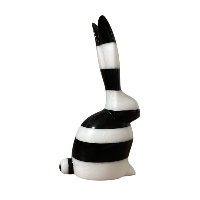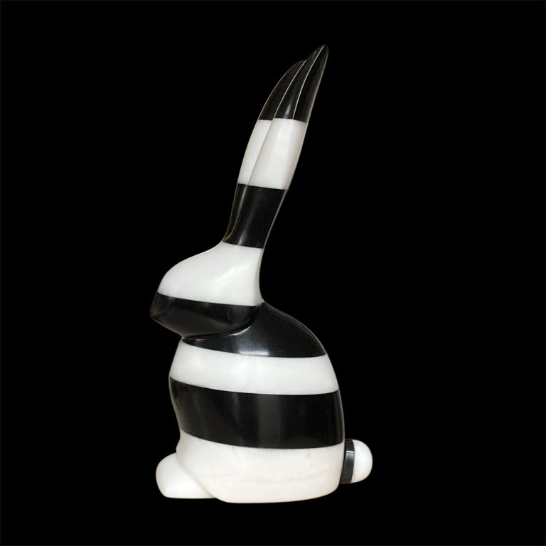 Hare is gemaakt uit een combinatie van 2 harde steensoorten, Zwarte Serpentijn en Witte Albast. Haar figuren zijn altijd sierlijk gestyleerd.