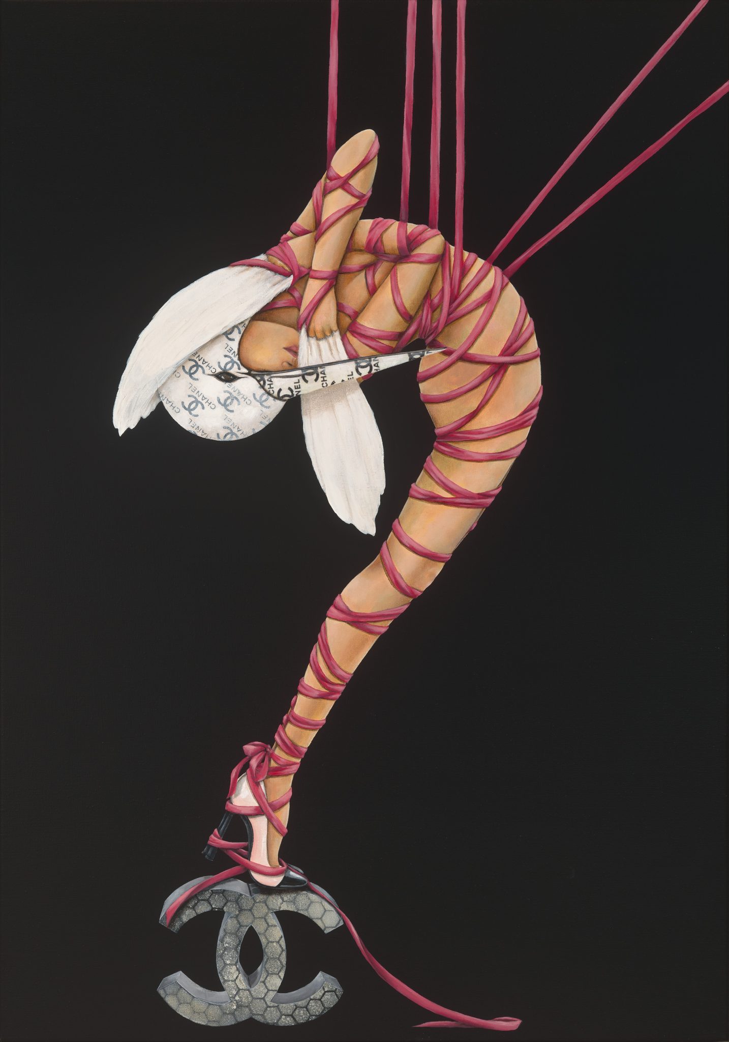 De zoetheid van het fijne luxe leven, weelde met o.a. mooie merken. Maar hoe vrij ben je zonder het luxe ‘masker’. De vogel staat voor vrijheid.