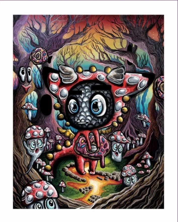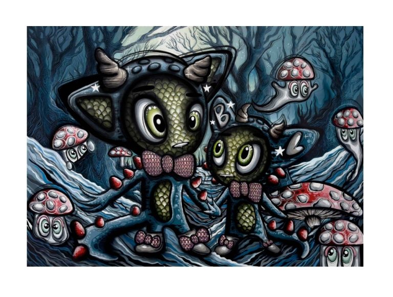 Een creatief nieuw pad sloeg Loes dit jaar(2025) in en naast haar bekende Pjipje en Kakkie werd Stego op het linnen doek ‘geboren’.