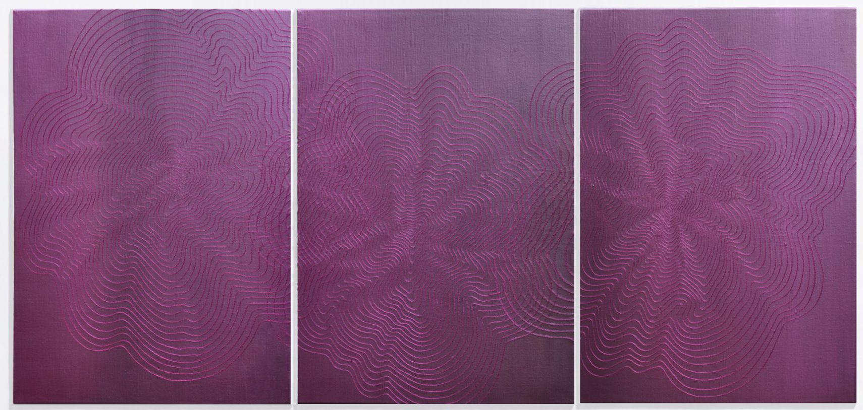 Jaarringen van een boom, gestikt over 3 linnen doeken. Dit drieluik heeft de kleur van clematis in bloei, zomers en tevens een warme kleur voor in de herfsttijd. Het is een ware blikvanger in huis