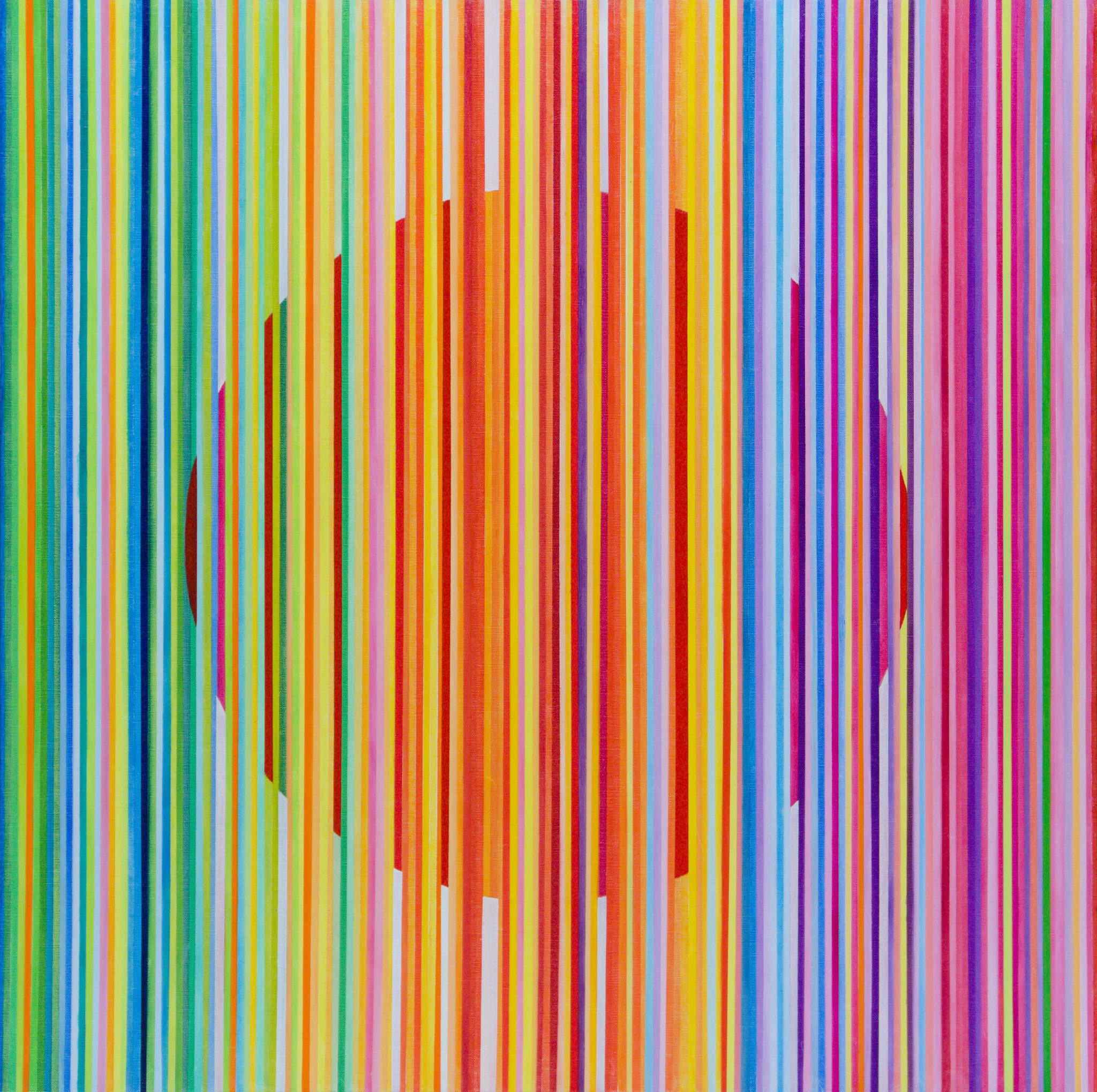 Dit is 'Nomura', Dit betekent 'mooi' in het Japans. Anja heeft via het thema Japan de inspiratie gevonden om haar strepen schilderijen te combineren met de rode zon van Japan.