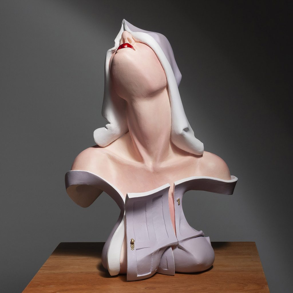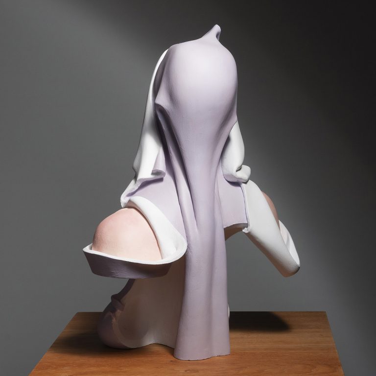 Momenteel zijn 2 van deze beelden in de galerie aanwezig, lila en lichtblauw. de lichtblauwe versie staat op een lage houten sokkel (6cm hoog)