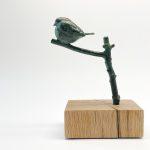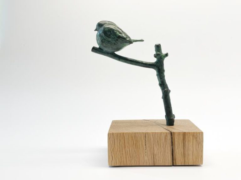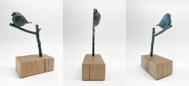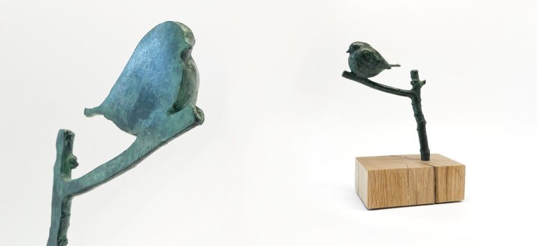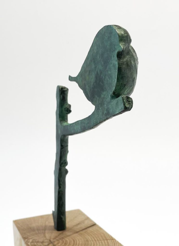Een Roodborstje zittend op een tak. Het kunstwerk toont twee gezichten: een realistische weergave en een abstracte zijde waarin het silhouet krachtig naar voren komt.