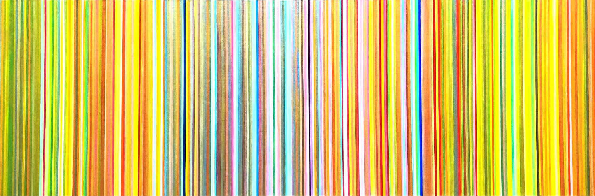 Kun je de natuur vangen in een streepjes schilderij? Ja, dat kan! Een groot schilderij van maar liefst 180 cm breed in de kleuren van de natuur.