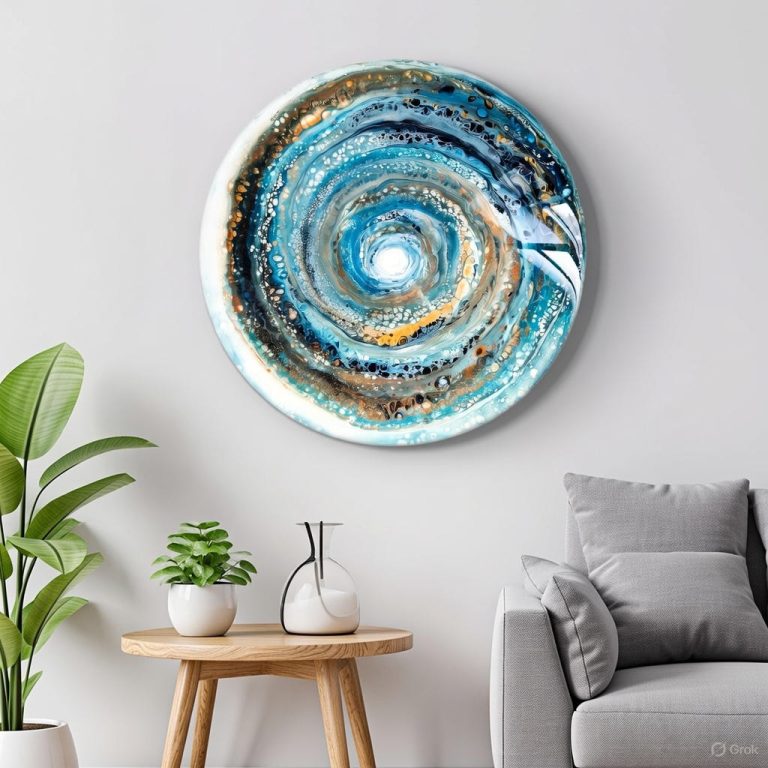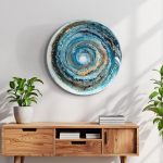 Deze schoonheid valt op zonder te overheersen. De circulaire vorm en de blauwe kleuren brengen rust, terwijl alle cellen en glinsters je eindeloos nieuwe schoonheid laten ontdekken. Betoverend! Afgewerkt met hoogglans hars en een moderne gouden rand.