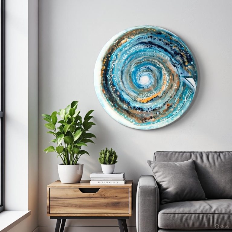 Deze schoonheid valt op zonder te overheersen. De circulaire vorm en de blauwe kleuren brengen rust terwijl er toch van alles gebeurt.