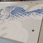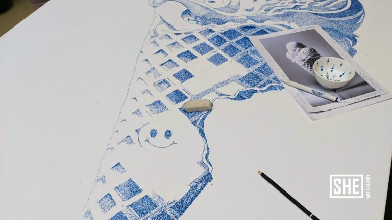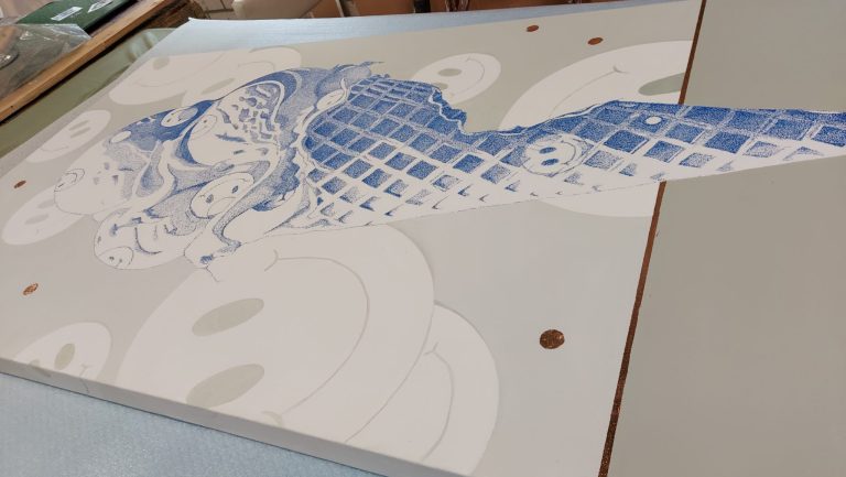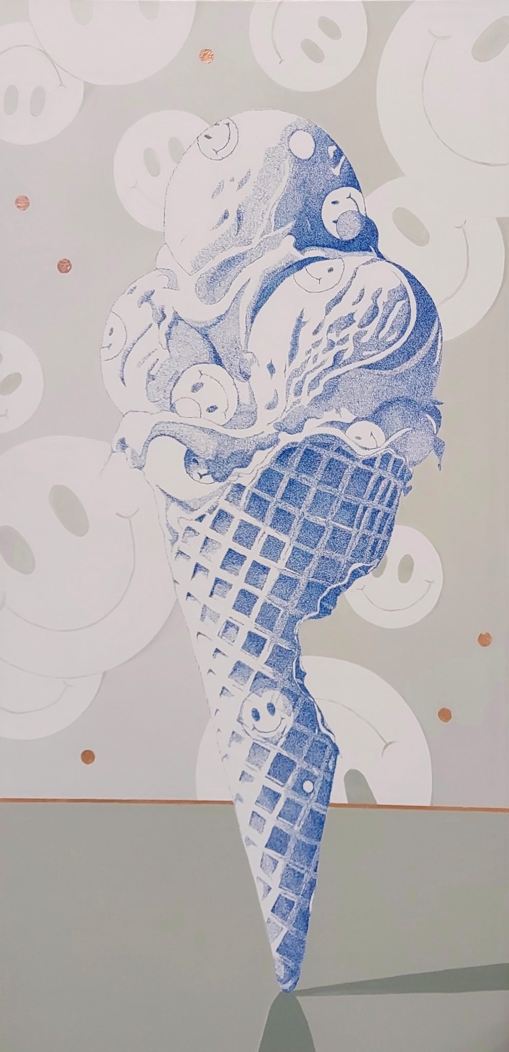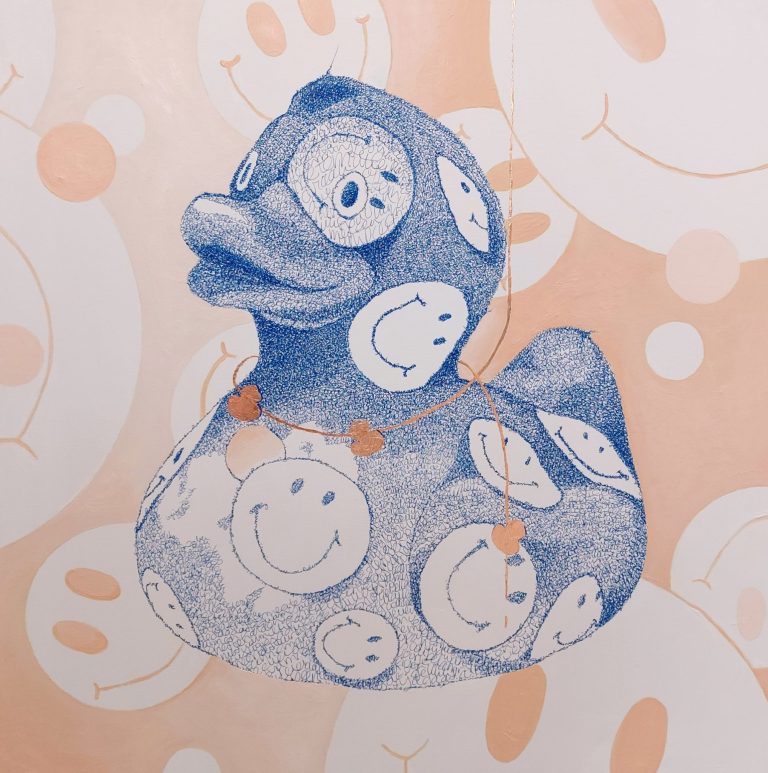 De Smileys zitten in het werk ‘verstopt’ en die mochten niet ontbreken. Dat is de positiviteit die Sheila de wereld in wil slingeren. Dat is hard nodig volgens haar.