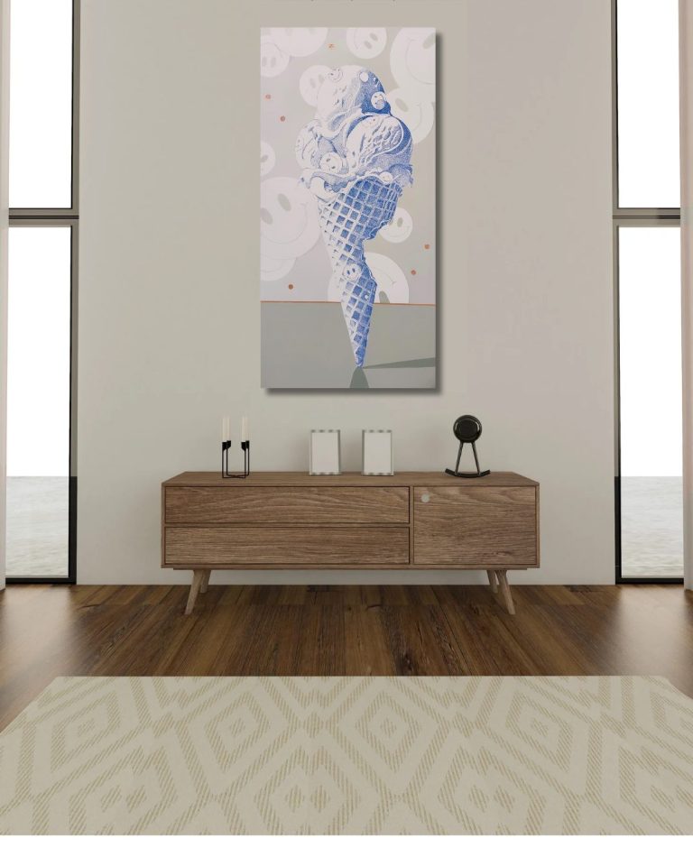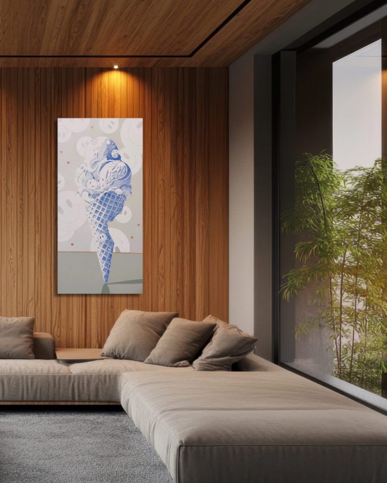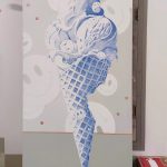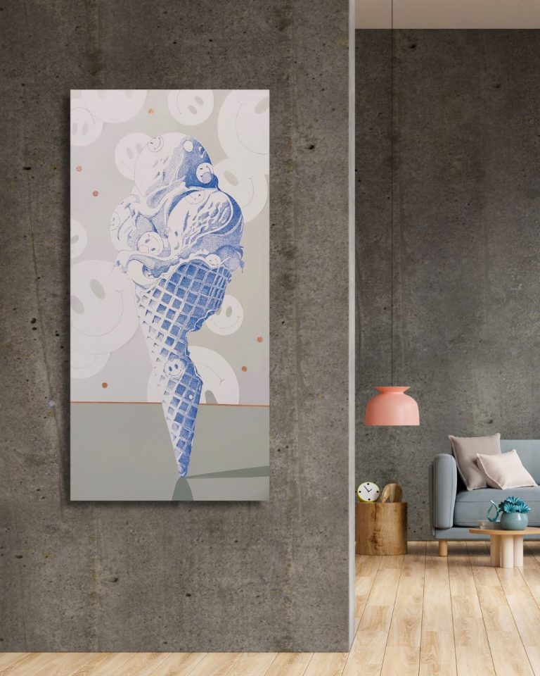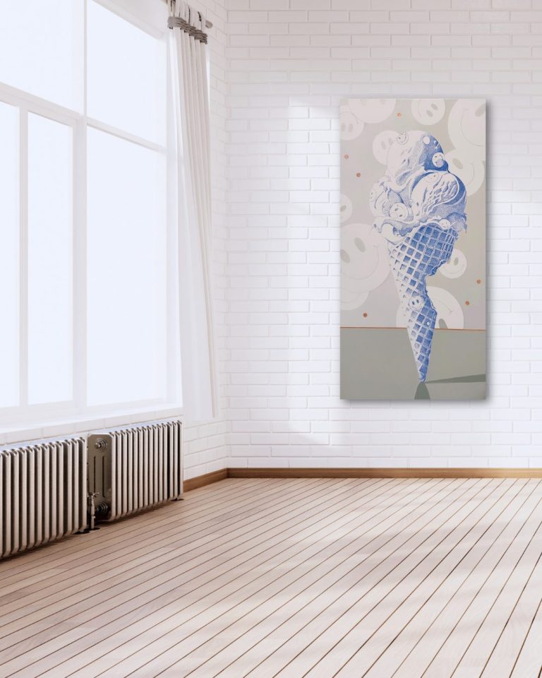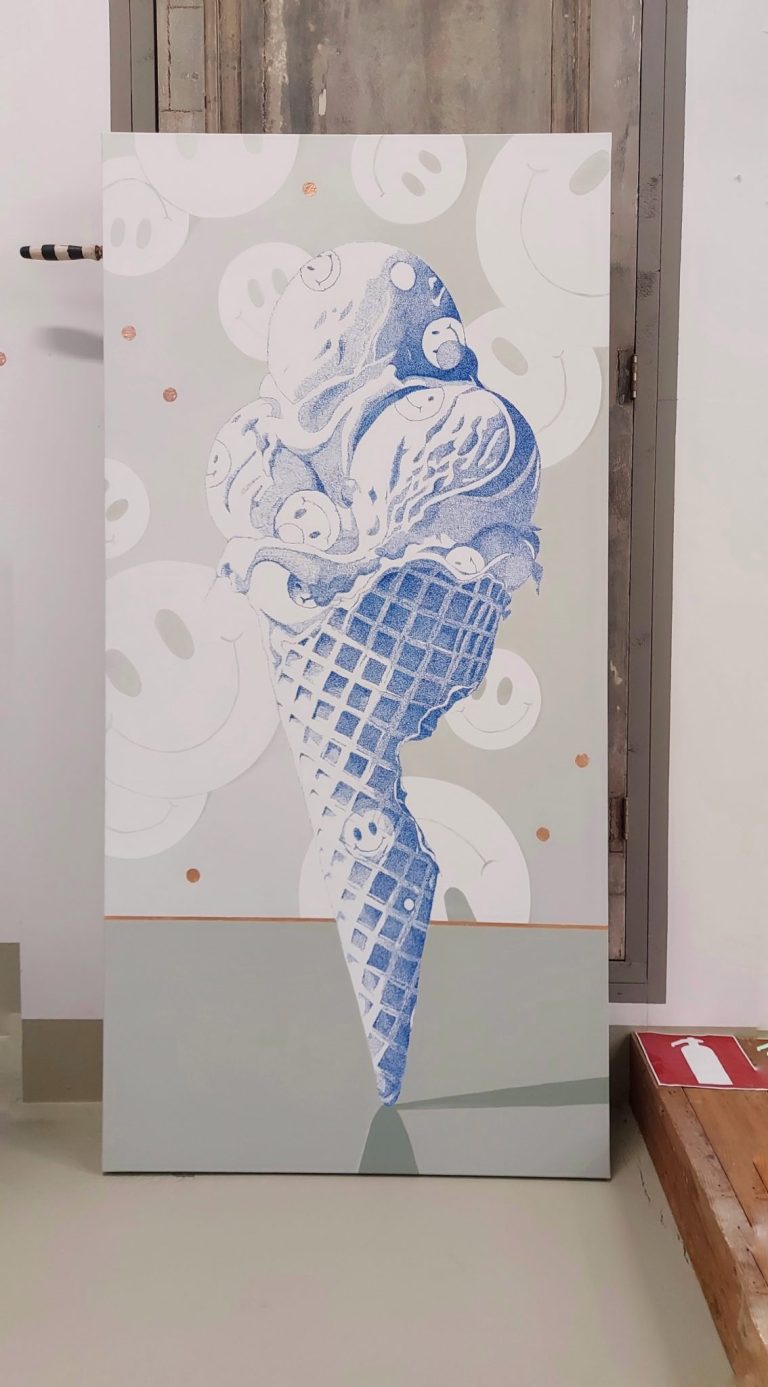 Mijmeringen, een ijsje geheel geschreven met pen op het linnen. Gedachtes, songteksten, leuke woordjes, hele verhalen of een boodschappenlijstje.