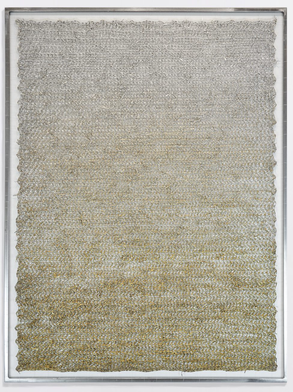 Helemaal gemaakt van hele korte dunne reststukjes van een linnen doek, ze worden aan elkaar geknoopt en gehaakt tot doek. Daarna beschilderd van champagne tot goud en opgespannen in een metalen frame.