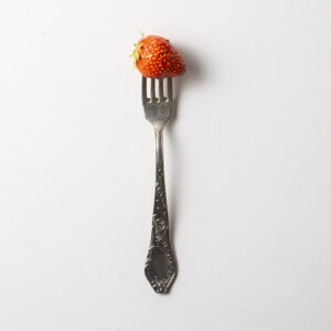 Een hele serie antiek bestek, vorken met een hapje, gegoten en beschilderd, prijs is per stuk. Vork met: Poffertjes Broccoli Garnaal Citroenschijfje Aardbei Spaghetti Friet met mayo Gehaktbal Loempia
