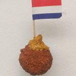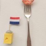 Een hele serie antiek bestek, vorken met een hapje, gegoten en beschilderd, prijs is per stuk. Vork met: Poffertjes Garnaal Aardbei Friet met mayo Gehaktbal Loempia
