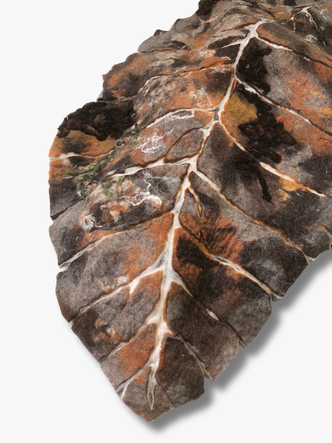 Dit blad is niet alleen warm van kleur, maar brengt ook warmte in huis. Gemaakt van verschillende soorten schapenwol en zijde.