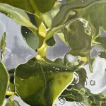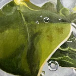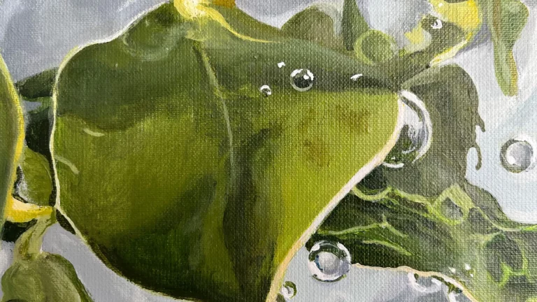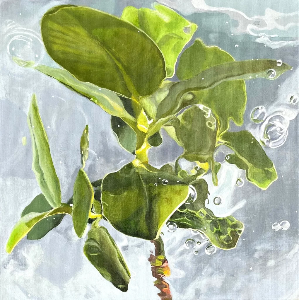 De schoonheid van de plant wordt in dit schilderij door de centrale compositie geaccentueerd, tegelijk is het kwetsbaar door de beweging, luchtbellen en kleurnuances.