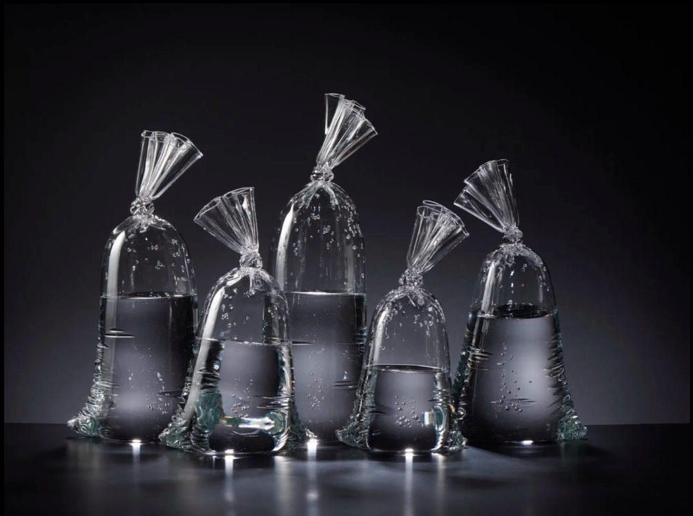 Een glazen sculptuur van een heel gewone zak met water.